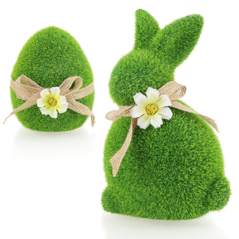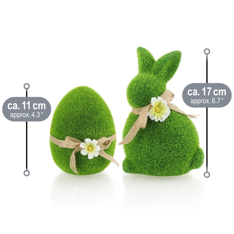 - SCOPE OF DELIVERY: 2x Easter decorative figures (1x each) // Material: ceramic, artificial grass, jute, plastic // Dimensions egg: approx. 9 x 11 cm (Ø x height) / Dimensions bunny: approx. 11 x 7.5 x 17 cm (width x depth x height) // Color: green, white, beige, yellow // Design: Easter egg, Easter bunny