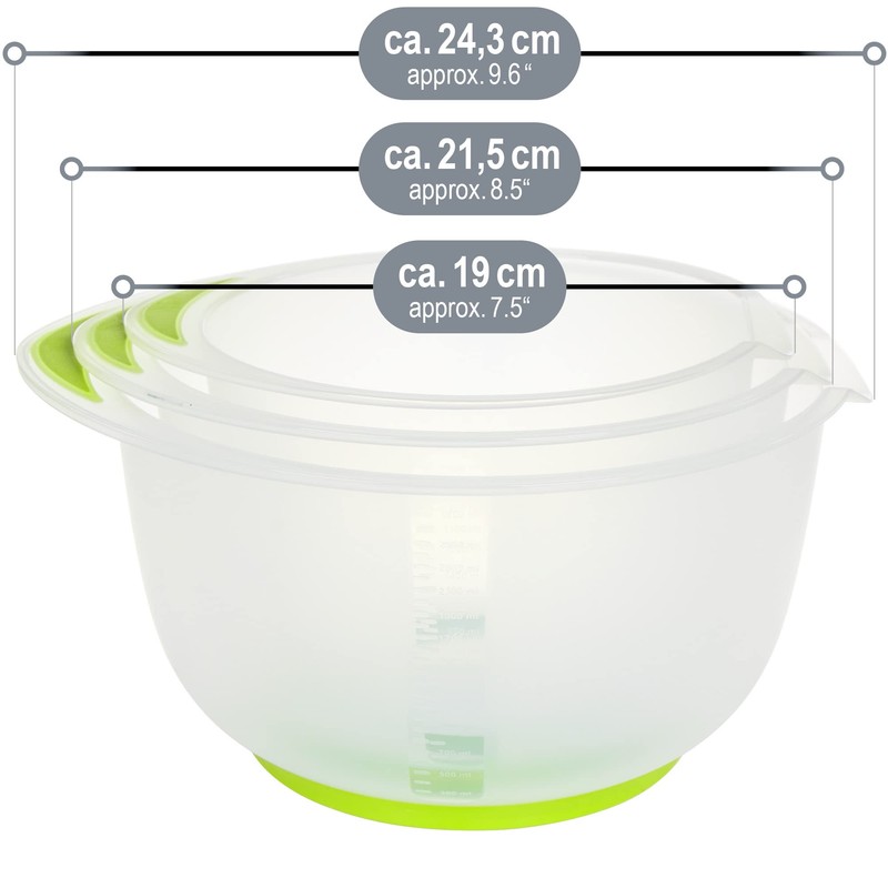 - LIEFERUMFANG: 3x Schüssel, 1x je Größe // Maße klein: 12 x 19 x 16,8 cm; Füllmenge: 1,5 Liter // Maße mittel: 12 x 21,5 x 19,2 cm; Füllmenge: 2 Liter // Maße groß: 12 x 24,5 x 21,5 cm; Füllmenge: 2,5 Liter // Spülmaschinengeeignet // Lebensmittelecht // Farben: transparent, grün // Material: Polypropylen (PP), Gummi