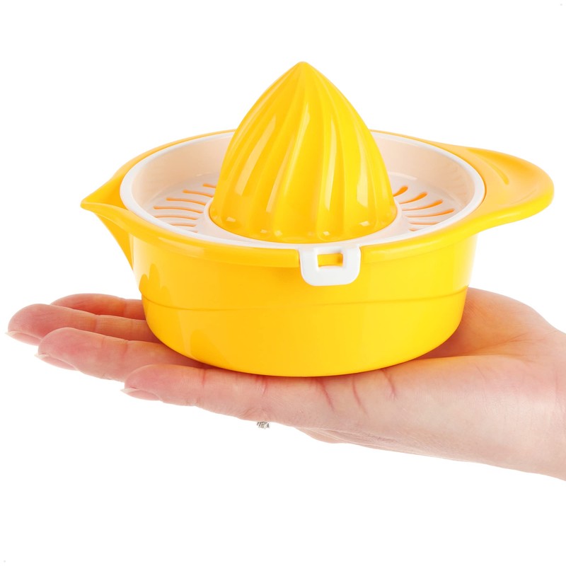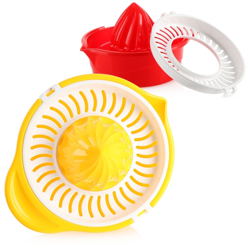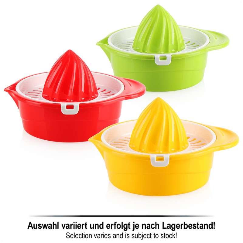 - Box contents: 3 x citrus juicer. Dimensions: approx. 14.5 x 11.5 x 9 cm (length x width x height) // max. Capacity: approx. 220 ml. Material: plastic. Colour: green, yellow, red, white (colour selection varies and is subject to stock). Note: dishwasher-safe, not microwave-safe