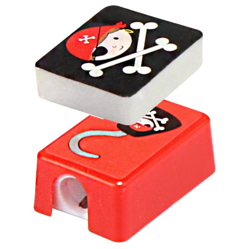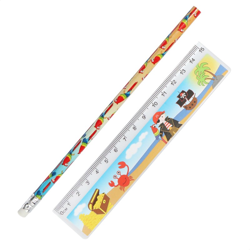 - CONTENT: 12x pencil, 12x ruler (15 cm), 12x sharpener, 12x eraser // Material: wood, plastic, metal // Color: red, black, white, multicolored // Motif: pirate, parrot, crab, treasure chest