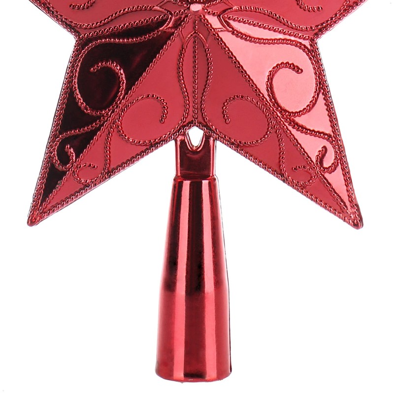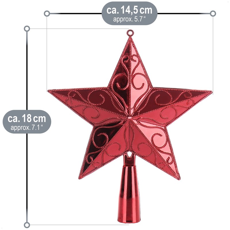- Contains: 1 x Christmas tree topper. Dimensions: approximately 18 x 14.5 cm. Hole size (diameter): approx. 2-3 cm. Material: Plastic. Colour: Red. Pattern: Ornaments.