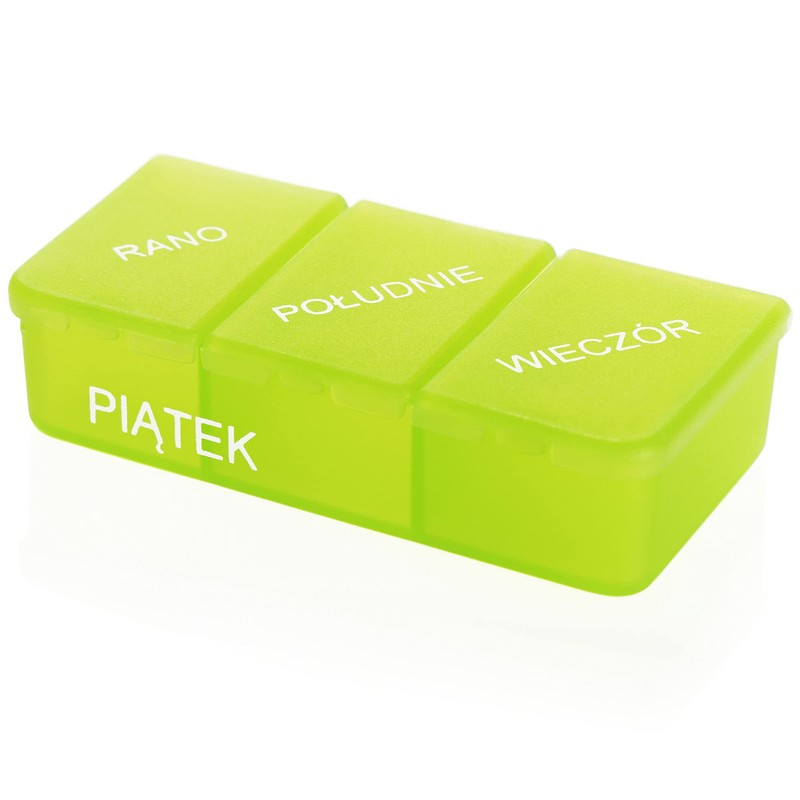 Medication dispenser in POLISH - medication box for 7 days - 3 compartments each - pill box - pill box - tablet box - weekly dispenser for storage [POLISH]Do you have to take different medications 3 times a day and don't want to lose track?Then this Polish medication dispenser is just right for you?Practical tablet box:The medication dispenser arranges the tablets and pills to be taken according to 7 days of the week and 3 times of the day (Rano, Poludnie, Wieczr).Do not confuse intake:The clearly legible labeled tablet jar provides an overview of medicines that must be taken regularly and must not be confused.Perfect for on the go:The pill box is ideal for on the go, in your handbag and when traveling! The compartments of the cans can be opened individually and, thanks to their compact size, can be taken anywhere.Handy pill box:The tablet box can be opened easily and closed securely. The hinged cassettes can be filled with tablets and pills as required.Item Features:Material: PlasticDimensions: dispenser approx. 14 x 8.5 x 4.5 cm, 3-pill dispenser approx. 8 x 4 x 2 cmColor greenLanguage: PolishBuy the medication dispensers in Polish now and keep track of your medication all week!