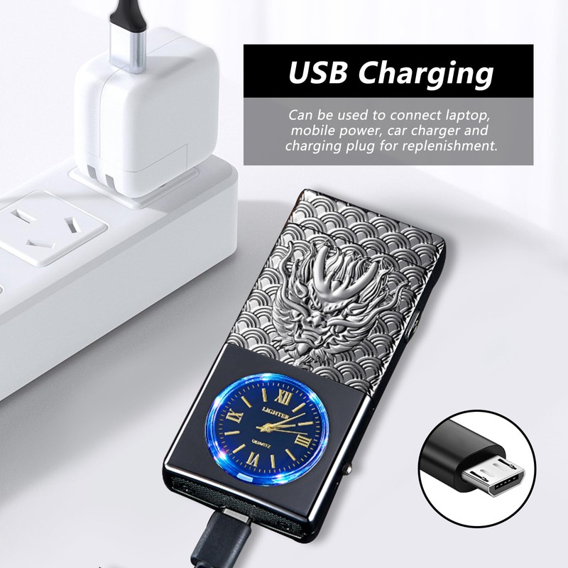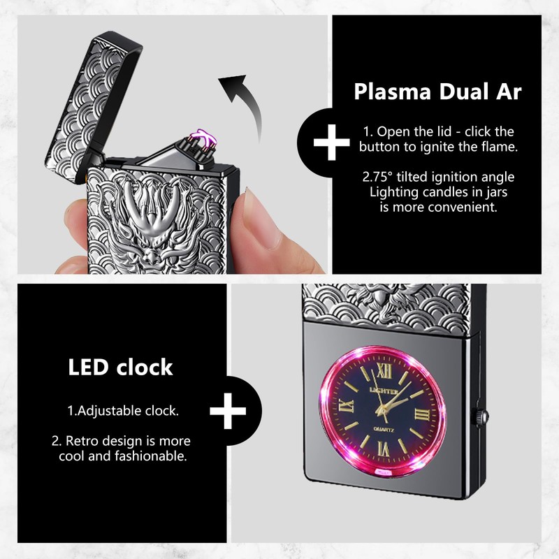 COMANYI Electric Lighter USB Rechargeable Lighter, Windproof Plasma Dual Arc Lighters, Flameless Cool Clock Lighters with LED Battery Indication for Candles, Incense Stick, Outdoor Use (Black, Dragon)