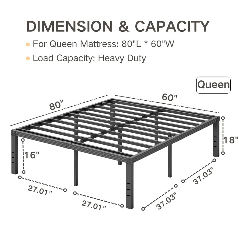• QUEEN BED FRAME DIMENSION:80" L x 60" W x 18" H | Weight: 44lbs | Support up to 1000 lbs