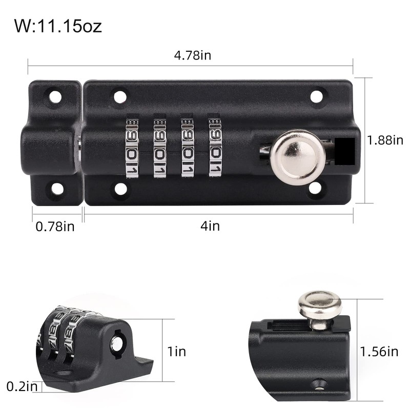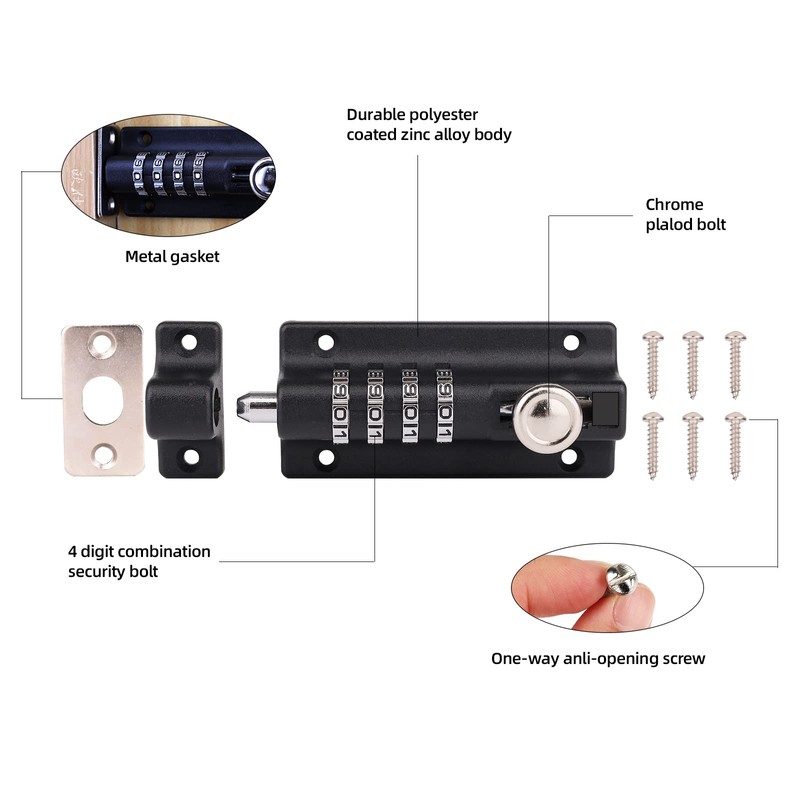 • Simple to use and install,4 Digit Combination the Combi-Bolts up to 10000 possible combinations give high quality security for indoor and outdoor applications