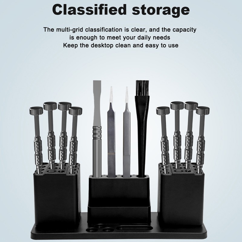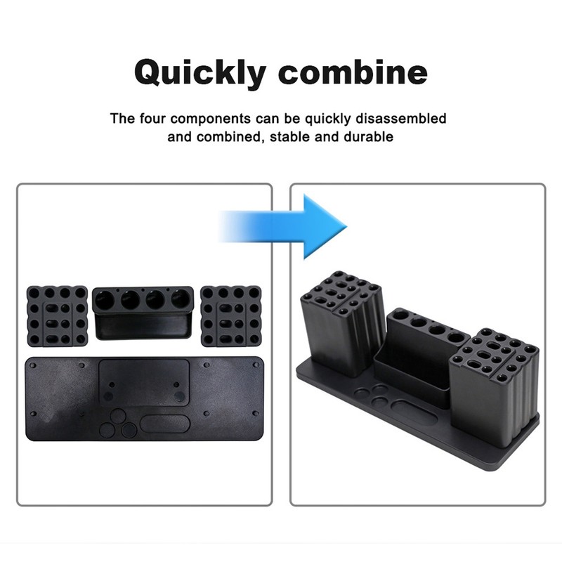 1、Flame Retardant ABS Material: This screwdriver organizer is made of flame retardant ABS material, with strong carrying capacity, heat and drop resistance, sturdy and durable, and the surface is made of frosted treatment process, beautiful and durable. 2、Silicone Non Slip Bottom Foot Pad: This screwdriver storage rack features silicone non slip foot pads on the bottom to prevent scratches on your desktop and for a more stable placement. 3、Detachable Combination Design: This screw driver organizer features a 4 component detachable combination design that keeps your hand tools organized and easy to find, organizing your tools and workspace in an orderly and simple way. 4、39 Holes Design: This RC repair work tool holder features a 39 holes design to store more screwdriver kits, pliers, tweezers, wire breakers or other hand tools. 5、Wide Application: This RC tools kit organizer holds screws and small parts from repair jobs, which is perfect for crafters, designers, advanced RC model enthusiasts, and machinists.