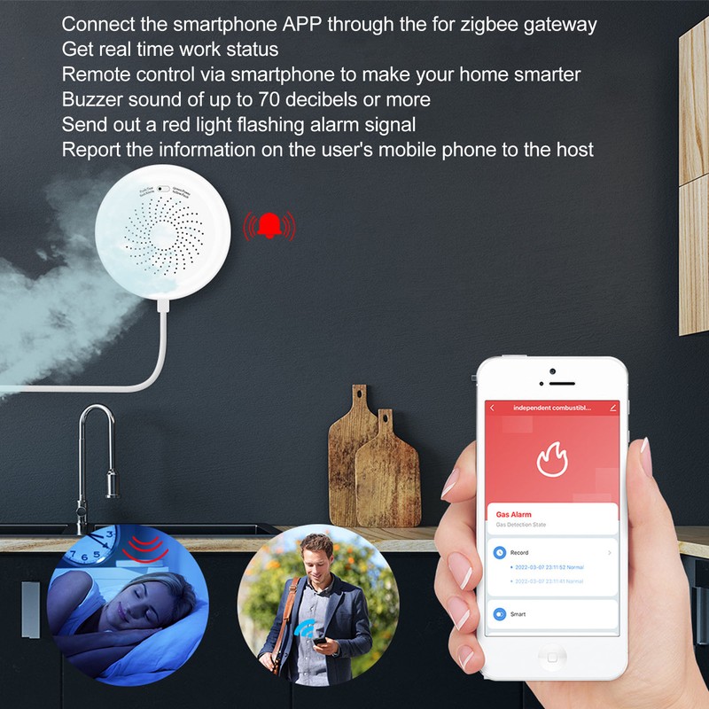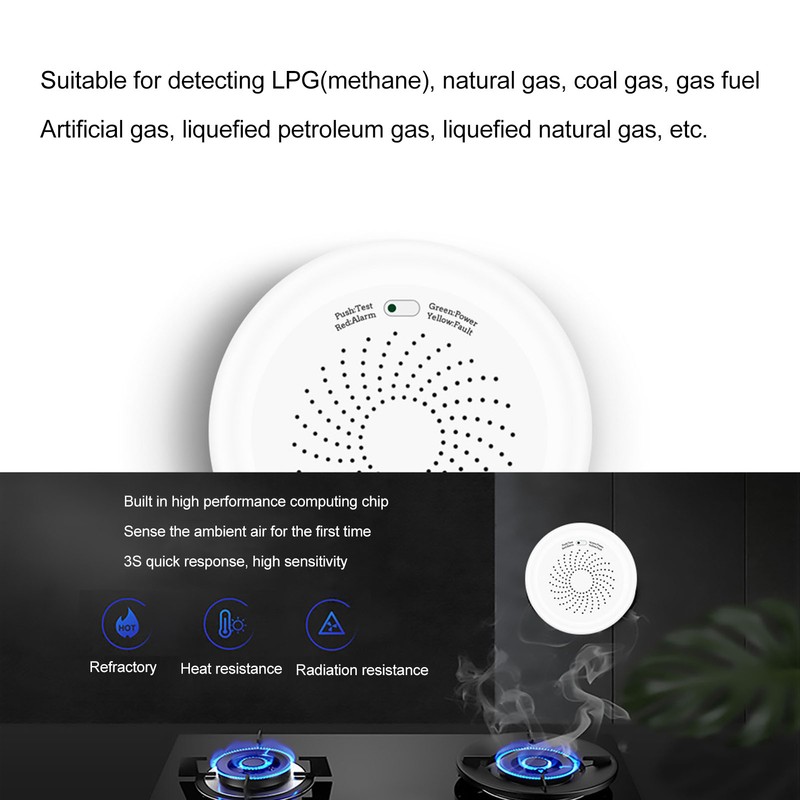 1、FAST AND SENSITIVE: This natural gas alarm has a built in high performance computing chip, which can sense the ambient air for the first time, 3S quick response, and has high sensitivity 2、APPLICABLE GAS: Suitable for detecting LPG(methane), natural gas, coal gas, gas fuel, artificial gas, liquefied petroleum gas, liquefied natural gas, etc. 3、USAGE SCENARIOS: Low current gas sensor, built in temperature compensation module, possess high sensitivity, accurate alarm, and prevent fire accidents. Can be used in residences, hotels, shops, offices and apartments 4、SMART HOME: Connect the smartphone APP through the for zigbee gateway, download the for Tuya Smart APP on for Google Play or for iOS App Store, create a family group on the APP, invite relatives to join, and check your family status and get real time work status, remote control via smartphone to make your home smarter 5、MULTIPLE ALARMS: When it is detected that the concentration of natural gas in the air reaches the standard, the detector will emit a buzzer sound of up to 70 decibels or more, and send out a red light flashing alarm signal, and report the information on the user's mobile phone to the host
