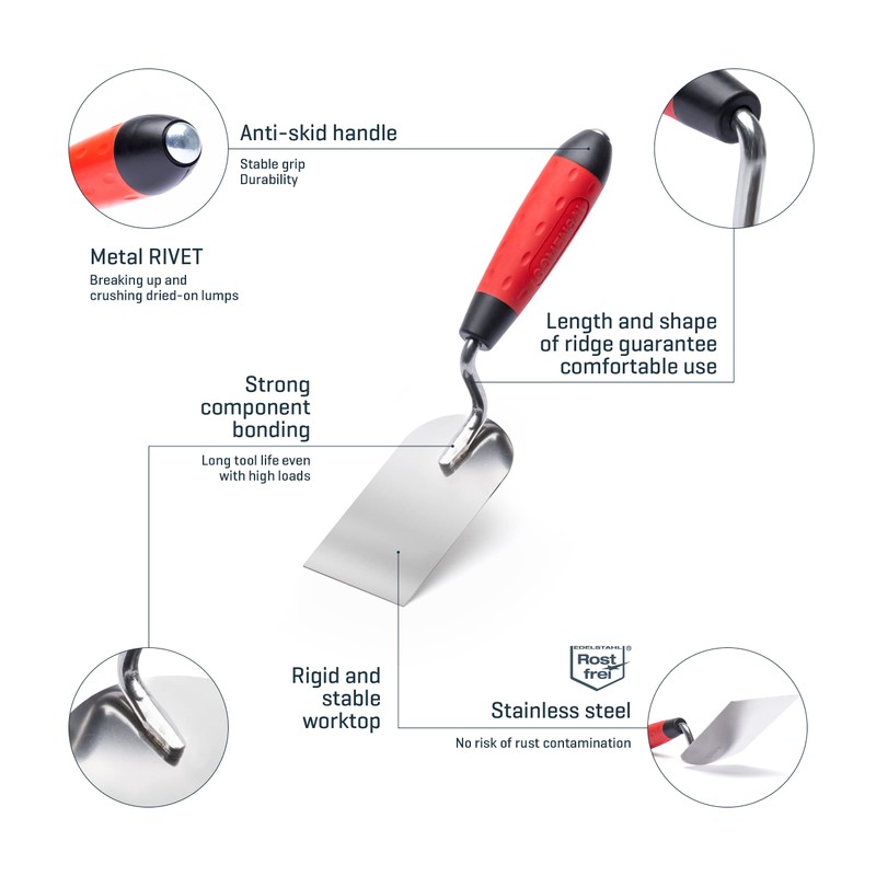 • Durability: the trowel is balanced, feels comfortable. The worksheet has been connected to the handle with a gooseneck to ensure a permanent connection of the elements even under high loads and compressive forces. Length and shape of the gooseneck ensure comfortable use.
