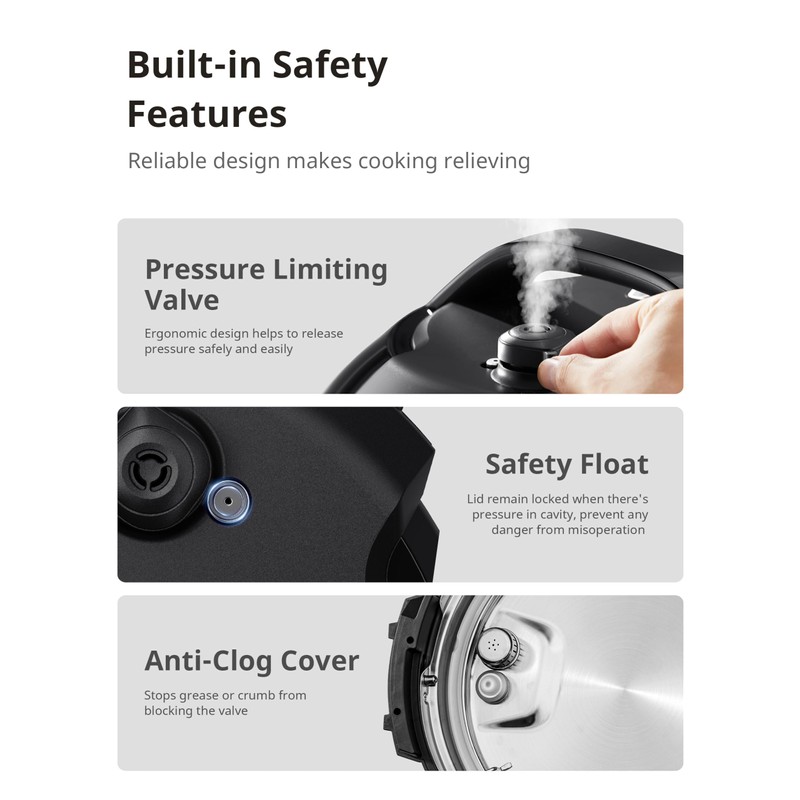 ADVANCED SAFETY PROTECTION- Lid lock, anti-block cover, pressure limiting valve, automatic pressure, and temperature control, overheat protection, and more