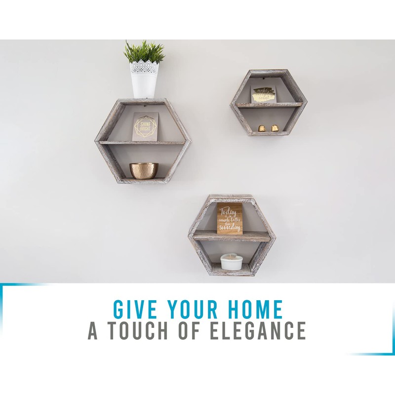 - Floating geometric shelves: Display charming showpieces, decorative items, and other prized possessions while offering functional storage with wooden display shelves. Reduce clutter and highlight your rustic décor while keeping everything organized