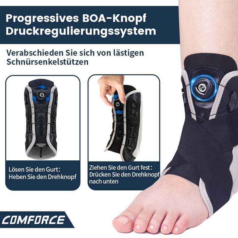 - Easy Knob Pressure System - Comforce ankle support uses an improved button and cord design that allows easy adjustment of elasticity with a twist of the button, providing even compression and a tailored fit to meet individual needs and experience optimal support.