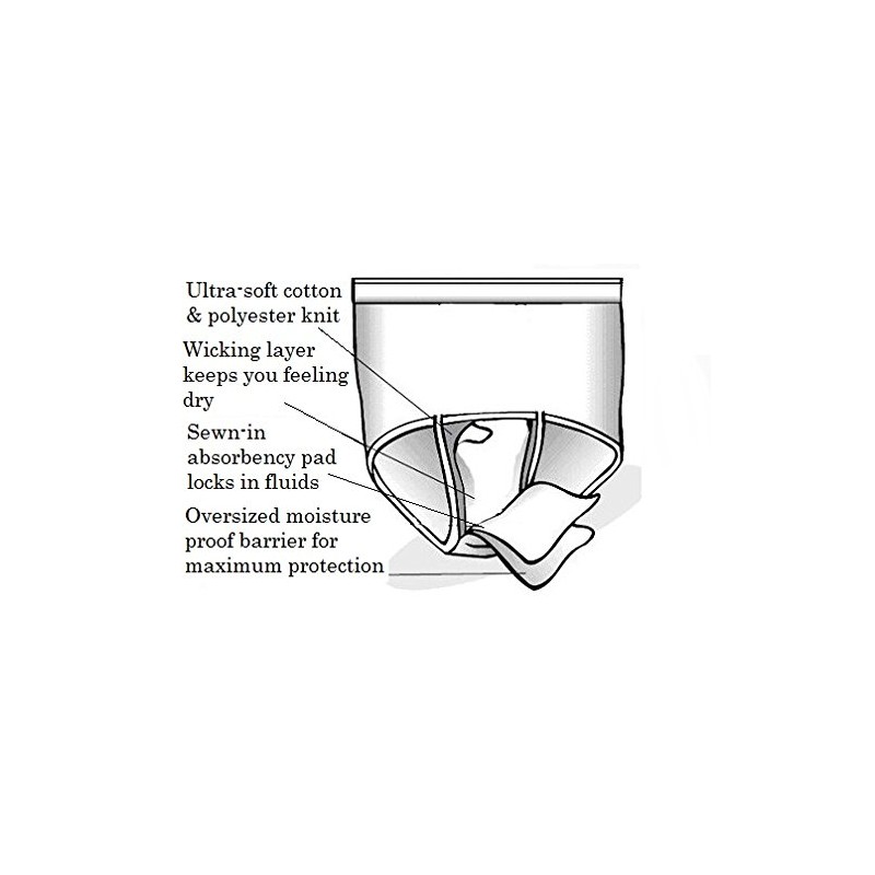 Features: 1st Layer: Ultra-soft cotton knit fabric that's very gentle on the skin 2nd Layer: A wicking layer that effectively pulls the moisture away from the skin 3rd Layer: Specially engineered sewn in absorbency pad that grabs, holds and locks in fluids 4th Layer: An oversized moisture proof barrier for maximum protection Function & Fabrication For moderate bladder incontinence - up to 6oz. lnner lining is made of super-soft 100% cotton, quickly wicks moisture away from skin Built-in 100% polyester absorbency pad Barrier is made of whisper-quiet, waterproof, reinforced vinyl to prevent spillover