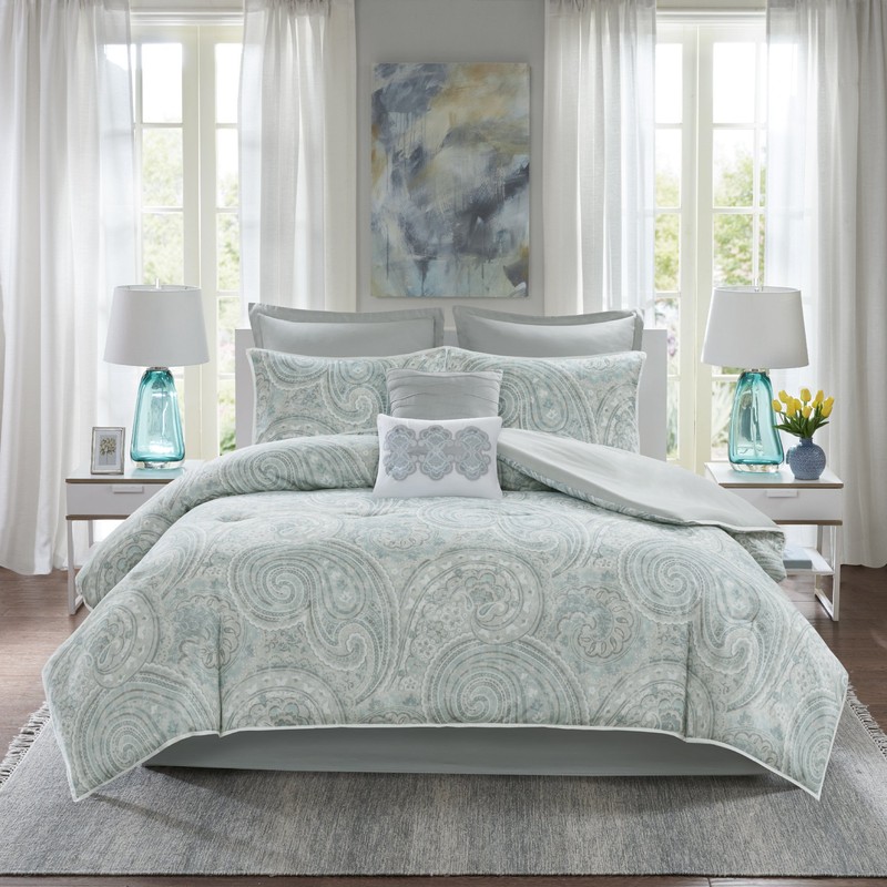 KASHMIR COMFORTER SET - Add an elegant touch to your bedroom with the Comfort Spaces Kashmir 8 Piece Comforter Set. The beautiful comforter features a large paisley print in a soft blue hue with a solid blue reversefor an exquisite look. Matching shams mirror the pattern of the comforterwhile the solid Euro shams coordinate with the bedding set to pull the entire ensemble together. Two decorative pillowsone with embroidery and another with fabric manipulationadd dimension and charm to the top of the bed. Completing the comforter set is a solid blue bed skirt with a 15-inch drop to give your bed a clean finish. Machine washable for easy carethis ultra-soft microfiber comforter set brings style and grace to your space. SERVICE - If you don't absolutely love this productreturn it within 30 days for a full refund. We'll work with you to resolve any issue and ensure that you're satisfied with your experience.