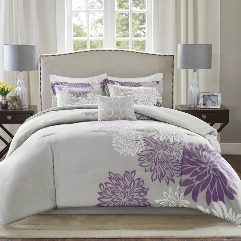 Comfort Spaces Enya Comforter Set-Modern Floral Design All Season Down Alternative Bedding, Matching Shams, Bedskirt, Decorative Pillows, King(104"x90"), Purple