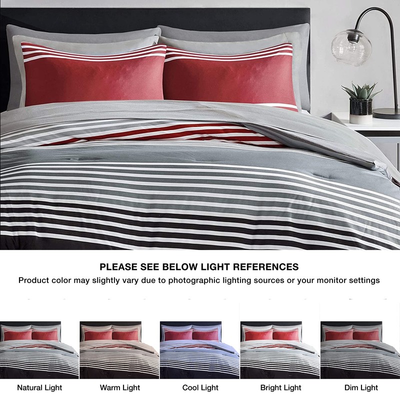 - COLOR AND PRINT – Colin, the comfort bedding set comes in stylish design featuring red and grey stripes and solid grey reverse. Paired with complementing solid grey sheet set, also includes two sets of pillowcases in two distinct shades of grey