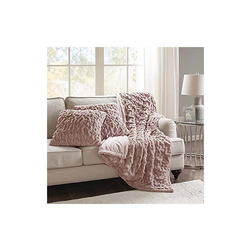 Comfort Spaces Ruched Faux Fur Plush 3 Piece Throw Blanket Set, Ultra Soft Fluffy with 2 Square Pillow Covers, 50"x60", Blush