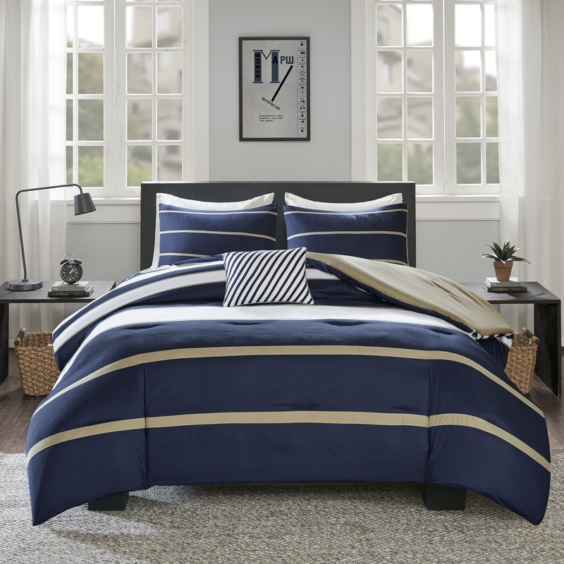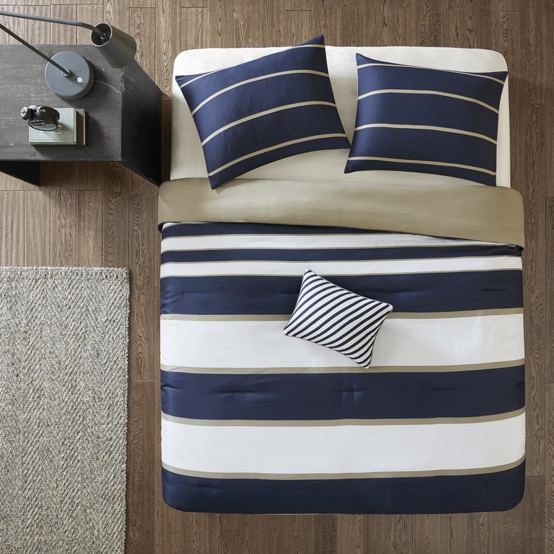 VERONE COMFORTER SET - The Comfort Spaces Verone Comforter Set uses a modern color palette to give a basic stripe pattern a handsome update. The comforter sports bold stripes in a variety of widths in navy white and accents of khaki. Coordinating sham(s) features khaki stripes on a navy ground to bring the dapper design to the head of the bed. The decorative pillow reiterates the striped pattern in intricate embroidery offering the finishing touch to the set. SERVICE - If you don't absolutely love this product return it within 30 days for a full refund. We'll work with you to resolve any issue and ensure that you're satisfied with your experience.
