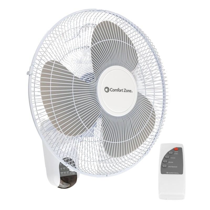Comfort Zone 16-Inch Wall mount fan with full function remote control, adjustable vertical tilt, metal grille and 3 speeds. 13-Inch pull control cords.HBC - driven to perfection producing quality products for everyday living.