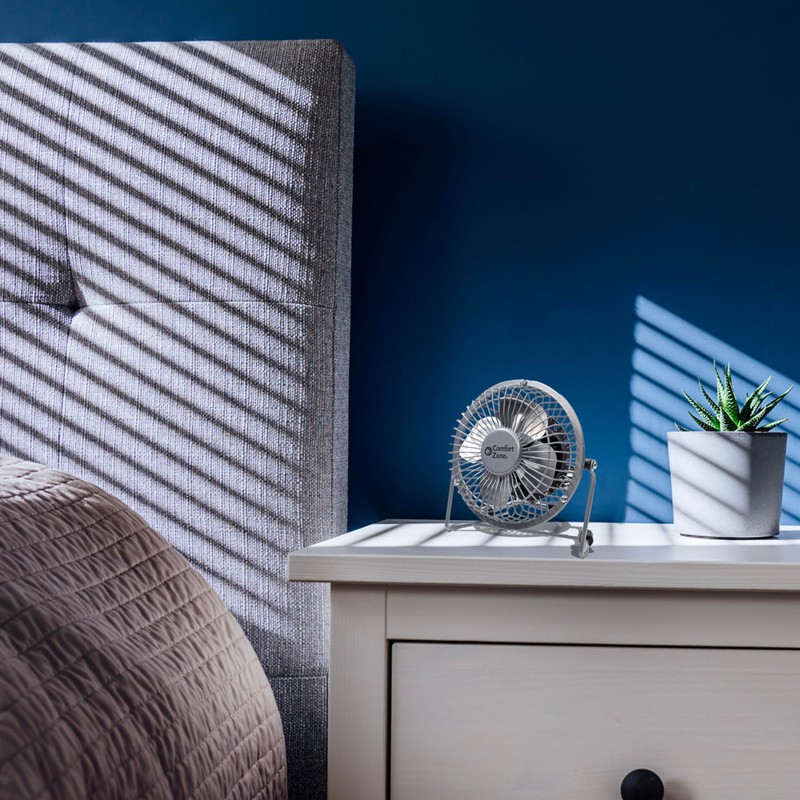 Comfort Zone 4-inch All-Metal Desk Fan with USB or Power Cord, Single Speed, 360 Degree Adjustable Tilt, Compact & Durable Mini Electric Fan for Home, Office or Travel Use, Silver