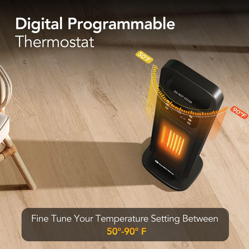 - DIGITAL PROGRAMMABLE THERMOSTAT: Set the temperature by pressing the arrows on the control panel or remote control, adjustable between 50°F and 90°F (10°C and 32°C). Once the desired temperature is set, the heater will stay on until the room temperature matches the digital display. It will then cycle on and off to maintain the desired temperature. Long press the arrows to continuously increase or decrease the temperature for easy adjustments.