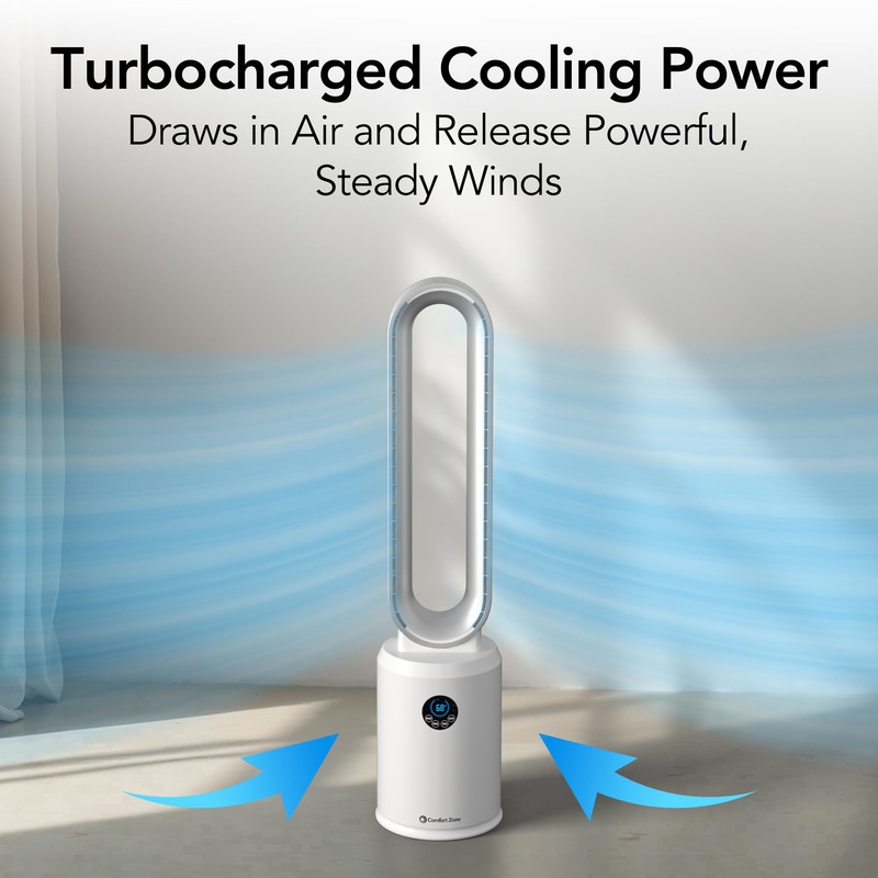 • Designed with safety and efficiency in mind, this bladeless tower fan delivers smooth, even airflow without the risk of injury. The Comfort Zone bladeless tower fan is an ideal summer essential for homes with children and pets, offering both cooling comfort and protection.