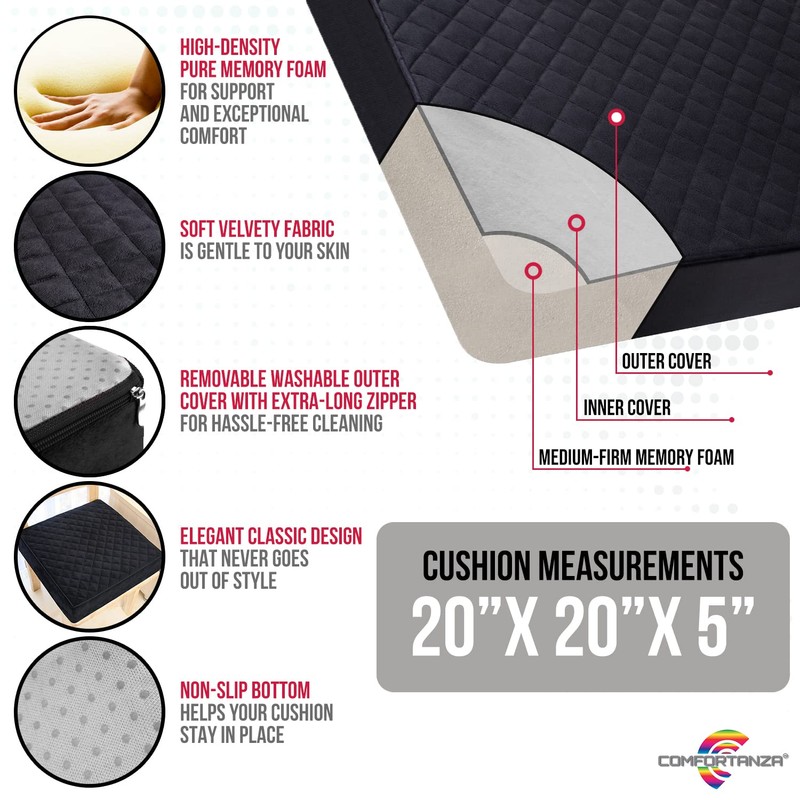 COMFORTANZA Large 20x20x5 Inches Memory Foam Square Thick Non-Slip Chair Seat Cushion for Recliners,Armchairs,Couches - Floor Cushion - Sciatica, Tailbone Pain & Pressure Relief - Medium-Firm - Black