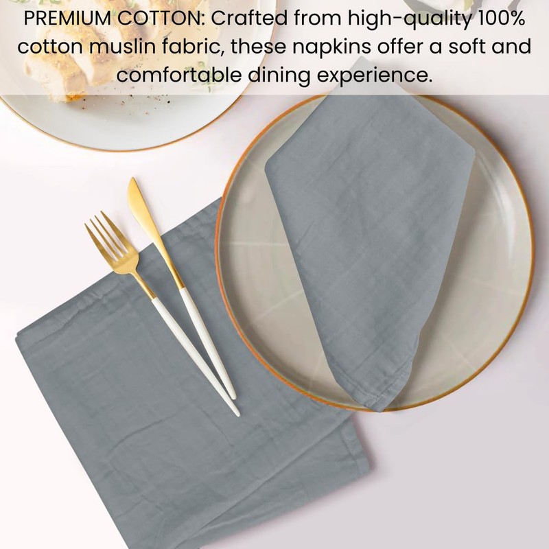 - MUSLIN FABRIC 100% COTTON: Elevate your dining experience with our muslin fabric napkins, crafted from 100% premium cotton. Muslin fabric is known for its softness, breathability, and durability, providing a luxurious feel for your table setting.
