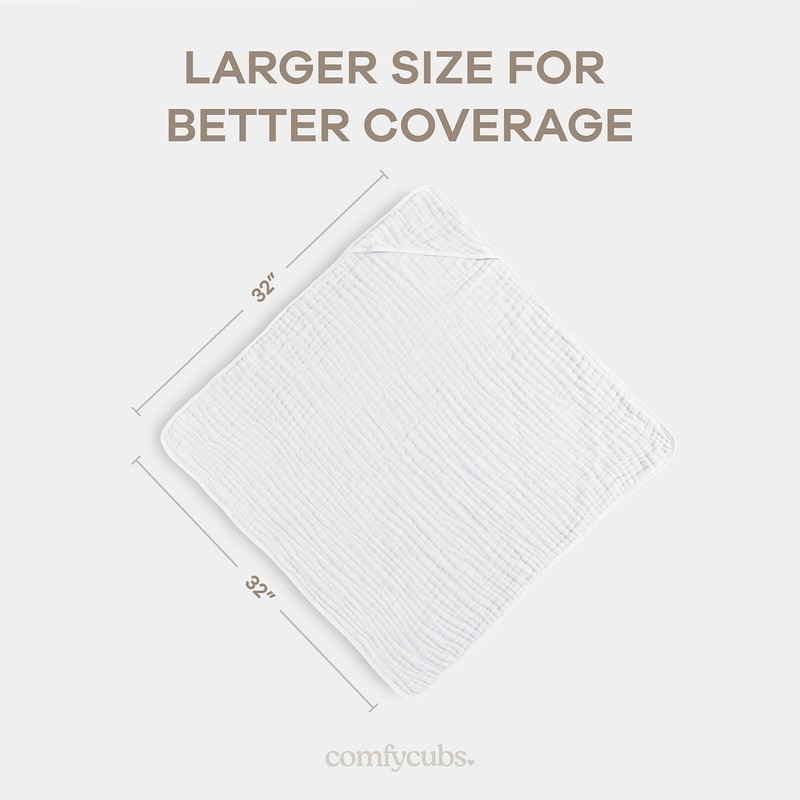 Comfy Cubs Hooded Towel 2-Pack, Large 81cm x 81cm - 6 Layer, 100% Muslin Cotton Hooded Towels for Toddlers and Kids - Ultra Soft, Warm, and Absorbent, Unisex White Baby Bath Towels