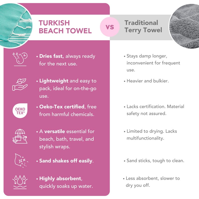 - SAND FREE TURKISH TOWELS: Say goodbye to sandy messes! Our beach towel effortlessly shakes off sand, keeping you clean and comfortable during your beach outings.