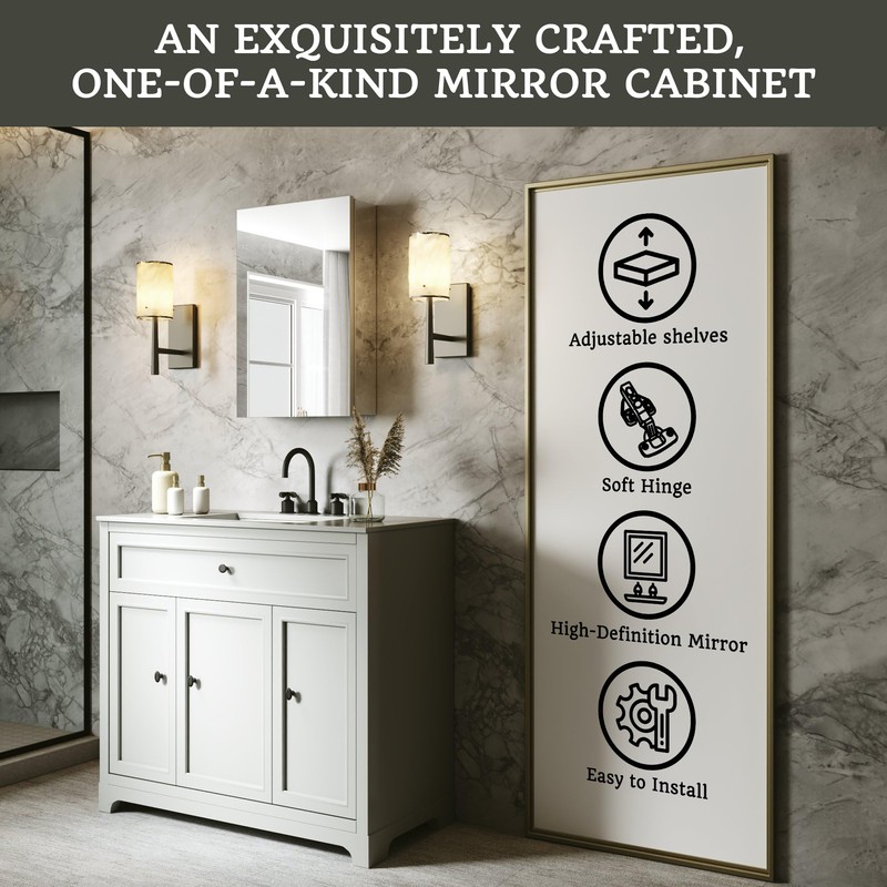 - 【Ultra-light and Long-lasting Durability】 – This medicine cabinet with mirror features a lightweight aluminum frame, which is 50% lighter than traditional wood and 35% lighter than steel, making installation a breeze—even for solo installers. Its moisture-proof, rust-resistant construction ensures that it withstands the humid bathroom environment, and the innovative hanging design provides added stability and security. Combining modern style and practical storage, this bathroom medicine cabinet with mirror is built to last while complementing your bathroom's decor.