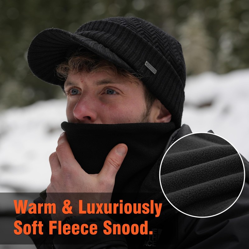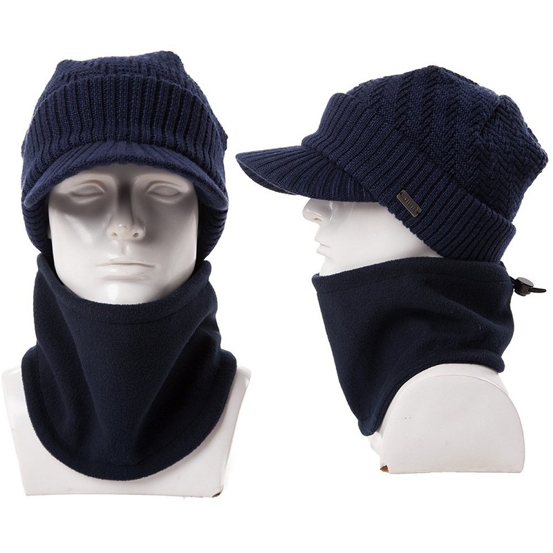 Comhats 50% Merino Wool Knitted Hat with Peak for Men and Women with Fleece Neck Circle, Winter Hat with Edge, Fleece Lined Running Hat, blue-black