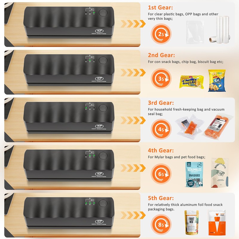 - Adjustable to 5 speeds: the bag sealer has 5 adjustable speeds, can weld different types of bags. 1 Gang: For clear plastic bags or OPP bags and other very thin bags. 2-gear: for common snack bags or chip bags or biscuit bags etc. 3-gear: for the household food storage bag and vacuum seal bags. 4-speed. For Mylar bags and pet food bags. 5 gears: for relatively thick aluminium foil food snack packaging bags.