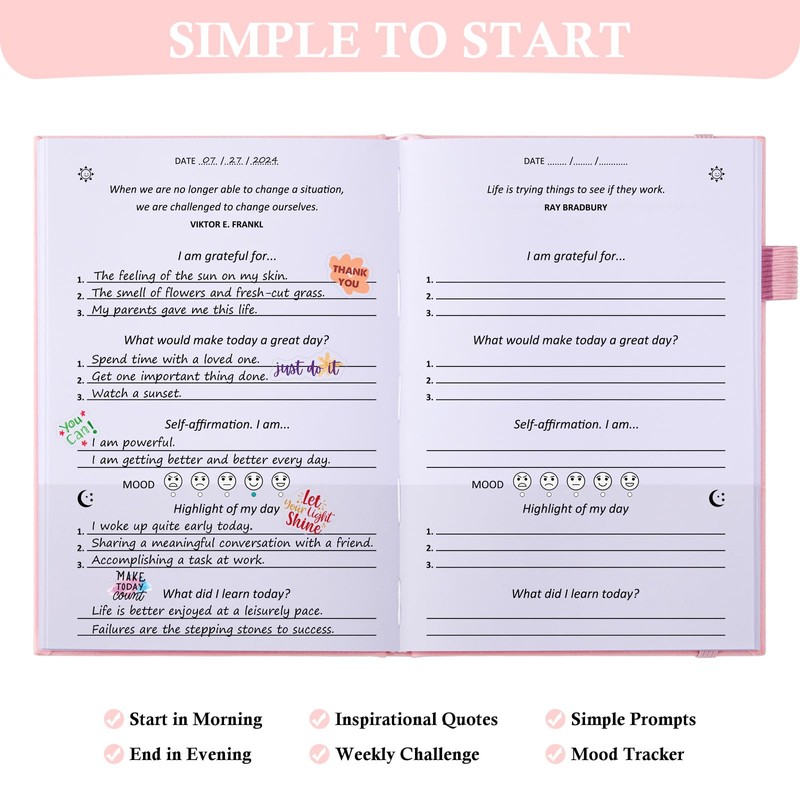 - Inspirational Stickers - This aesthetic gratitude journal includes 4 colorful motivational stickers in the back pocket. More than 90 waterproof patterns can be used as inspirational stickers for daily journals, water bottles, laptops, and more. You can paste the stickers in different places to inspire you to be in a good state anytime and anywhere.