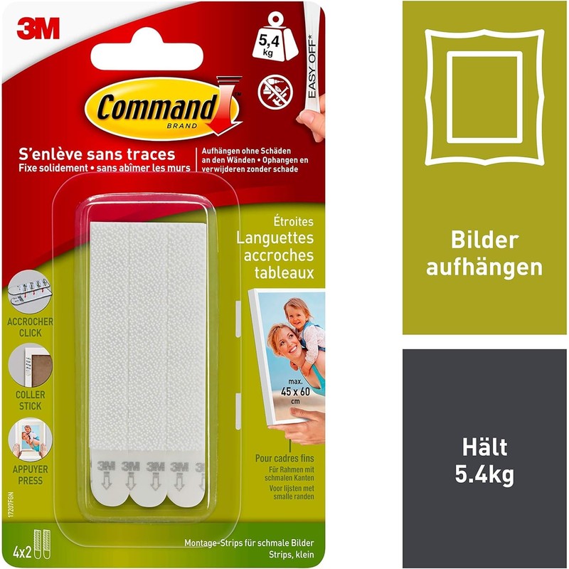 - GRÖSSE UND GEWICHT: Diese Streifen eignen sich zum Aufhängen von Bildern mit dünnen Rahmen von maximal 45 cm x 60 cm und halten maximal 5,4 kg. Für gestrichene Flächen, gefliest, aus Metall oder Holz