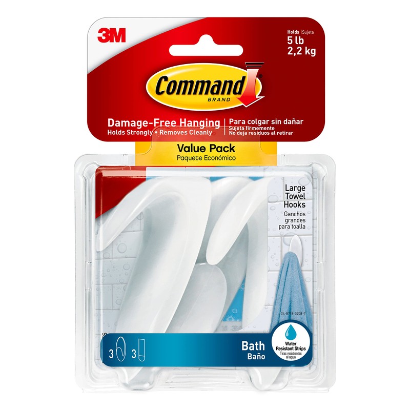 Command BATH17-3ESF Large Towel Hooks, Value Pack, 3-Hooks, 3-Large Water-Resistant Strips