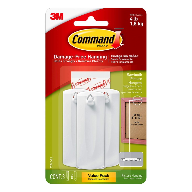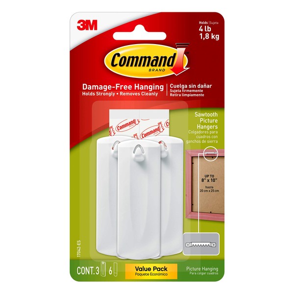 Command Wire-Back Sawtooth Frame Hangers, Holds up to 5 lbs, 3 Singulars Hangers, 6 strips, Decorate Damage-Free