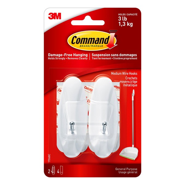 Command Wire Hooks, Medium, White, 2 Hooks 4 Medium Strips