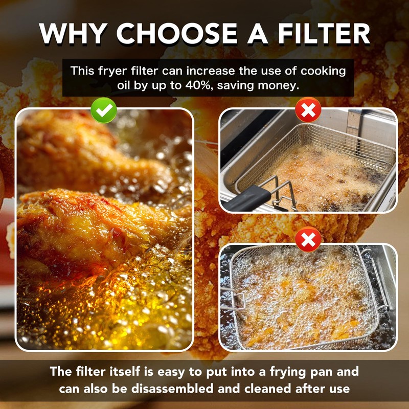 - 【 Extend oil life by 40% 】 Significant cost savings: The 550 micron precision stainless steel filter can efficiently filter food residues, prevent debris from falling into the low-temperature zone of the frying furnace and carbonizing, extend the service life of edible oil by up to 40%, reduce the frequency of waste oil treatment, and improve the consistency of fried food taste.