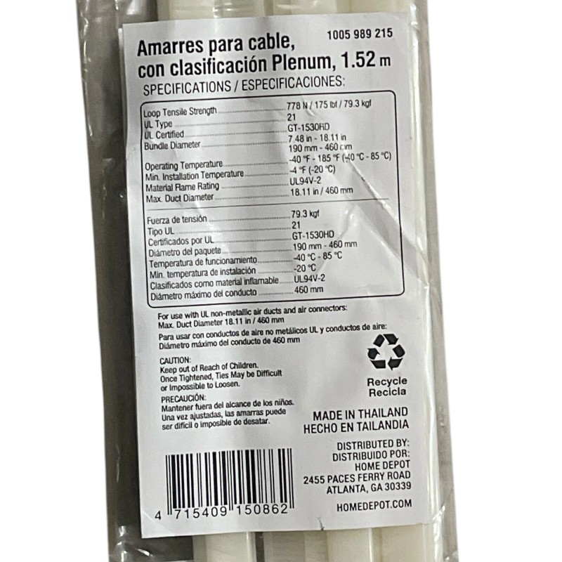 The Commercial Electric 15 Pack 60” Heavy Duty Nylon Cable Ties are ideal for organizing cables and wires in your home or office. These cable ties have a tensile strength of 175 lbs, making them suitable for heavy-duty applications. They come in a pack of 15, and each tie is 60 inches in length.