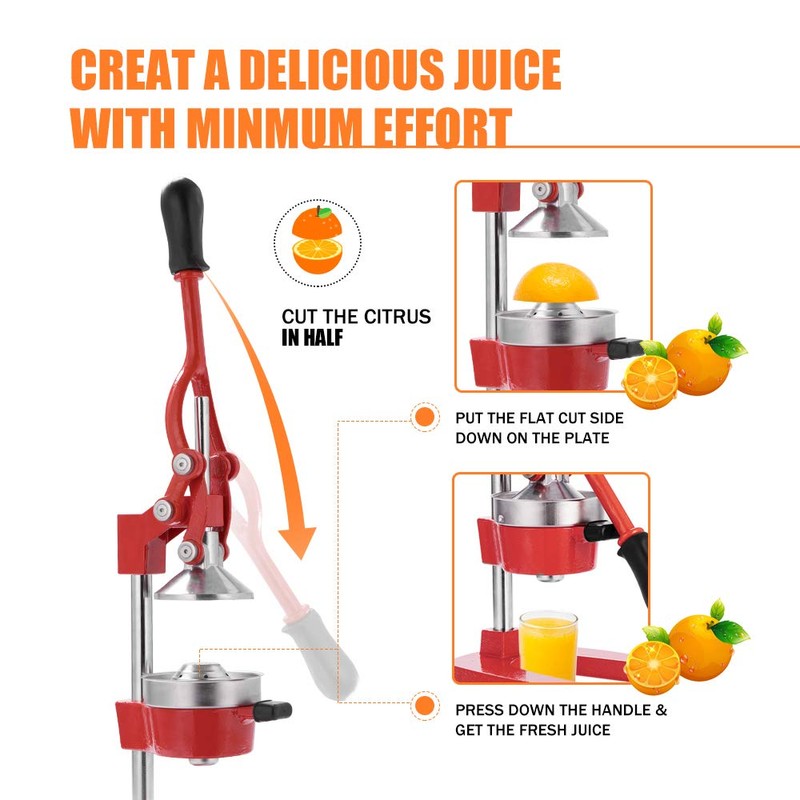 • DURABLE & SAFE TO USE - Made from 304-food-grade stainless-steel and heavy-duty solid cast iron construction; Heavy, substantial, smooth and it is effortless to get almost every drop of juice out of the fruit when you use it; Multiple colors available, it looks attractive on your kitchen counter