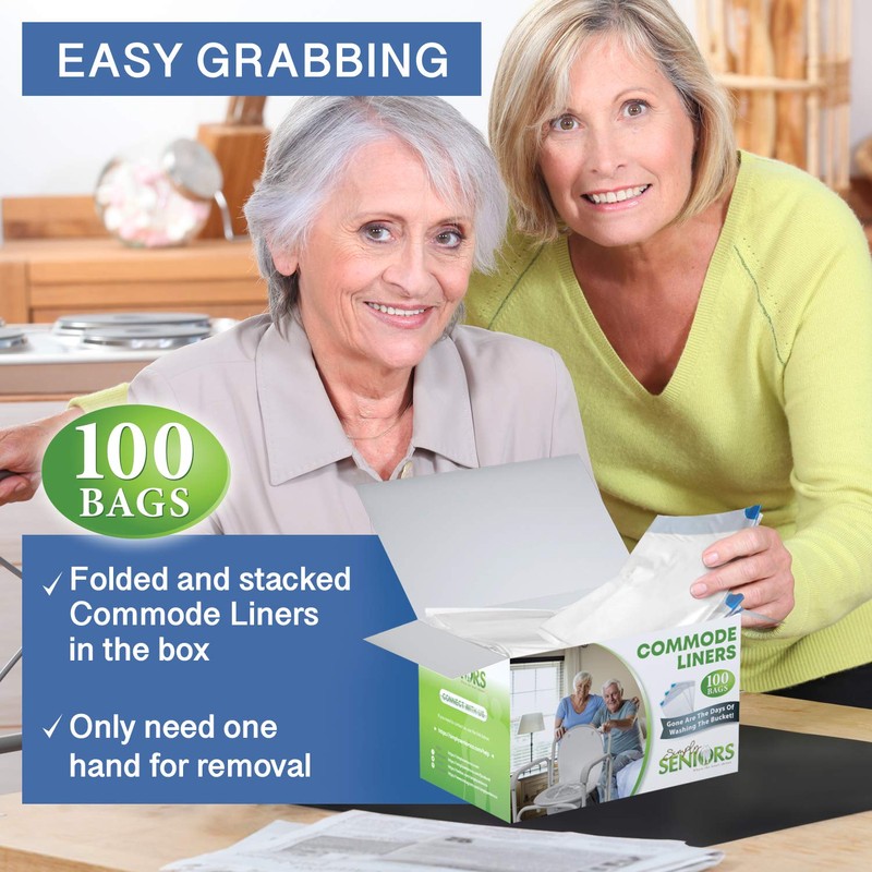 • 👌🏼 EASY GRABBING FOR SENIORS. No more fighting to find where to tear the commode bags. These 100 toilet liners disposable are much easier to get out of the box as they are individually folded instead of a roll. The way they're packaged requires only one hand for removing them from the box and is highly recommend if you have arthritic hands or have issues in your hands or fingers