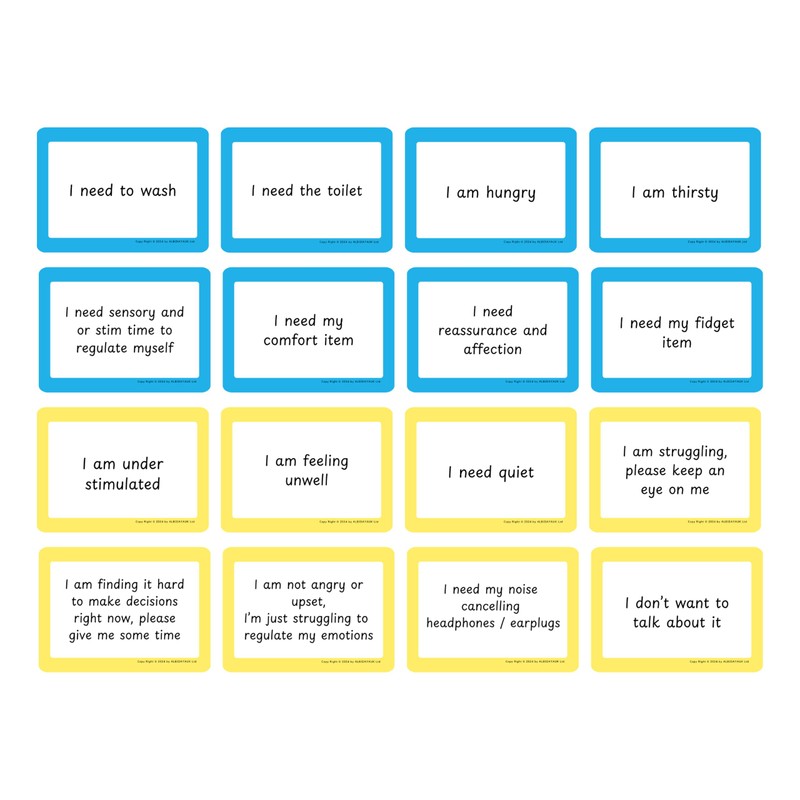 - 25 Double Sided Communication Cards: These cards facilitate clear and concise communication during non-verbal episodes especially for those with ADHD and Autism