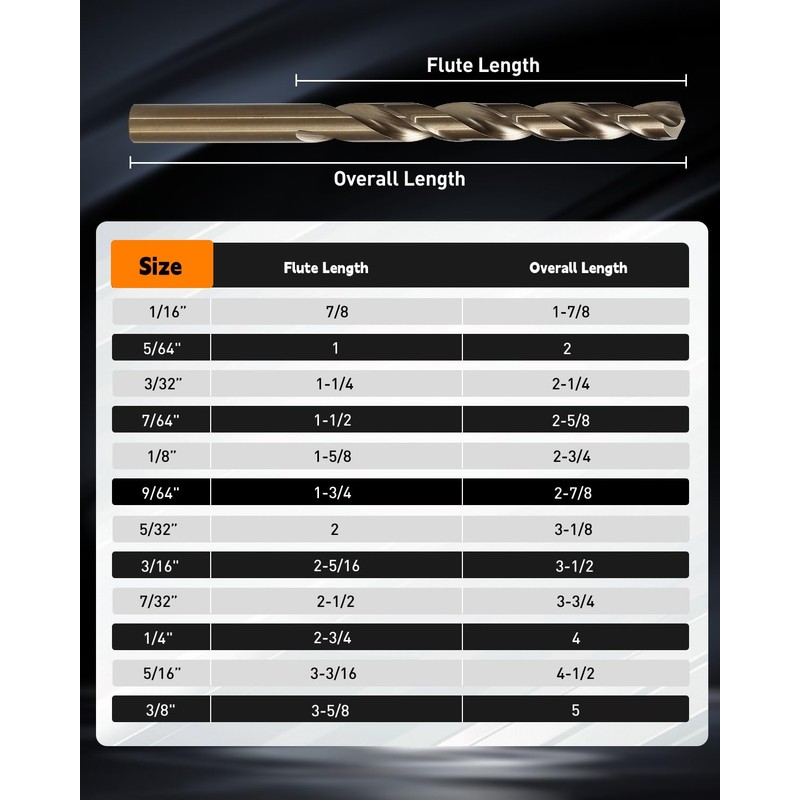 • SIZE INCLUDED: 15pcs jobber length drill bit set with plastic storage case including sizes:1/16" 2pc,5/64" 1pc ,3/32" 2pc,7/64" 1pc,1/8" 2pc ,9/64" 1pc, 5/32" 1pc, 3/16" 1pc, 7/32" 1pc, 1/4" 1pc, 5/16" 1pc, 3/8" 1pc.
