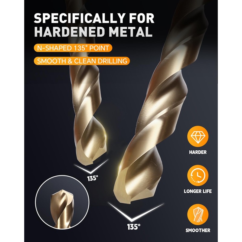 • TWIST DESIGN & PERFORMANCE: PRECISE 135°SPLIT POINT, gold oxide finish and round straight shanks. Prevent walking, clear chips and particles faster.Produced by precision fully ground which ensures chips move smoothly.