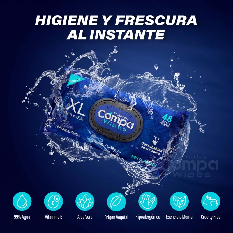Compa Wipes Toallitas Hmedas para Adulto, 100 Seguras para Desechar por el Inodoro NO Obstruyen el Drenaje, Enriquecidas con Aloe y Vitamina, Paquete