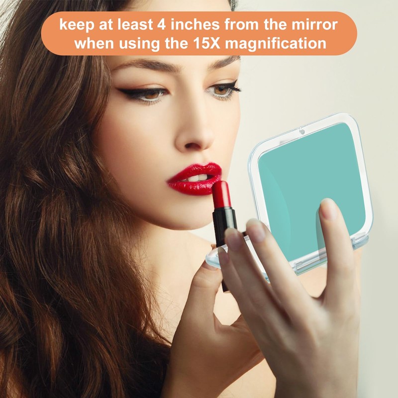 - 2 sides mirror & Anti-distortion - 1X and 15X Magnifying mirror, One side of the Compact Mirror is 15X Magnification for close up tweezing mascara or makeup application + 1x True View reflects your real face.