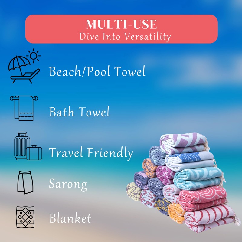 • TRAVEL-FRIENDLY DESIGN : Our beach towel for travel sand free is a game-changer for those on the go. With a sandproof and quick-drying fabric, this thin, lightweight towel is crafted from high-quality Turkish cotton. It’s large enough for comfort yet folds compactly, making it ideal for packing. Enjoy the beach, pool, or swim with our turkish beach towels oversized designed to keep you dry and stylish. Perfect for any summer vacation or spontaneous trip.