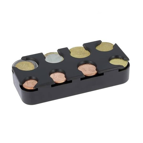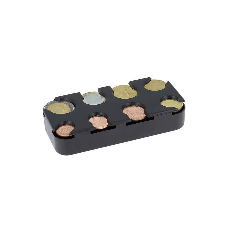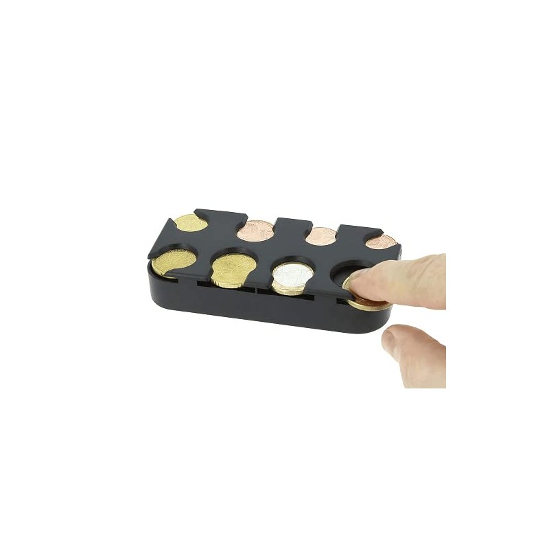 - Details The compact coin holder with 8 coin sorter is a device designed to safely and conveniently organize and store coins of different denominations. It is designed for people who frequently handle cash, such as merchants, cashiers or people who need to change coins regularly.