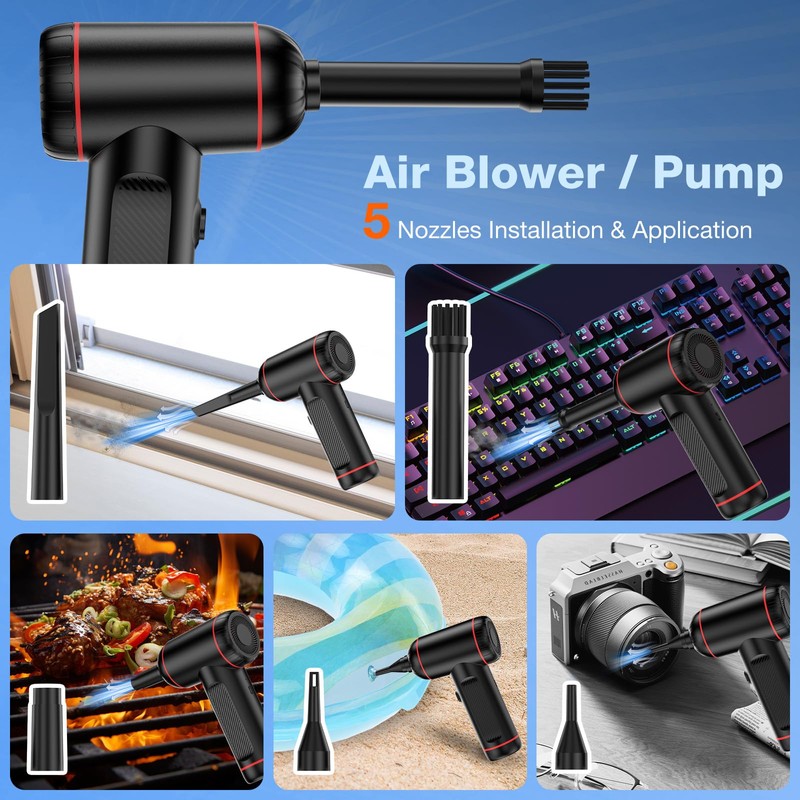 - Precision Cleaning with 5 Attachments-Includes flat nozzle (wide surfaces), brush nozzle (soft dusting), and extended nozzle (tight spaces)etc. Perfect for PC fans, camera lenses, and even LEGO sets