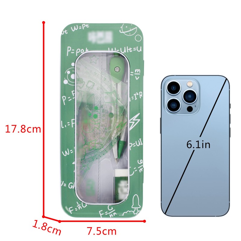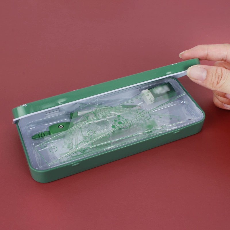 • Including: 1 School Compass, 1 Eraser, 1 Pencil, 1 pen, 1 Protractor, 1 Ruler(6"), 1 Square (60°), 1 Set Square (45°).
